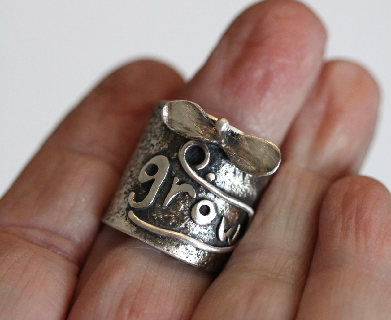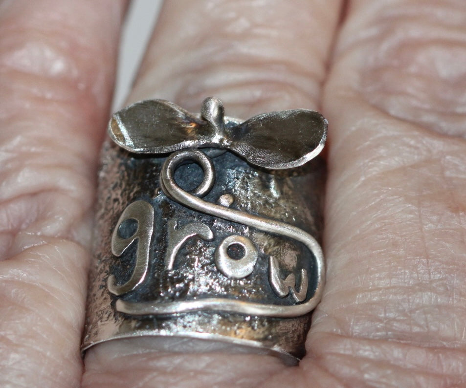 This handcrafted sterling silver ring features the word “grow” sculpted across a softly textured band, accented with a small hand-formed leaf resting above the lettering. The organic surface and oxidized finish give the piece a rustic, garden-inspired character — like a message shaped by nature itself.