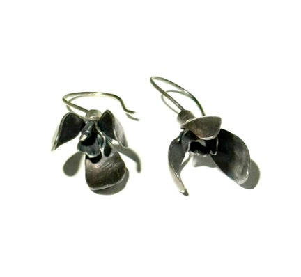 Each earring is individually formed by hand, giving the petals their gentle curve and natural movement. The softly oxidized silver highlights the sculptural details. Lightweight and comfortable, they sway subtly when worn, like blossoms stirred by a summer breeze.